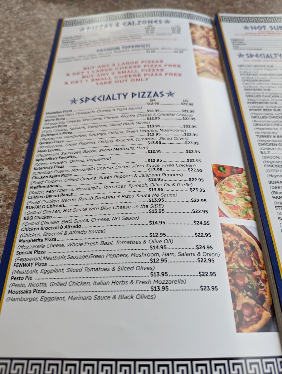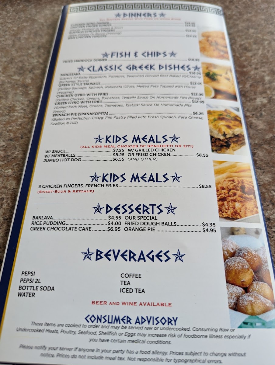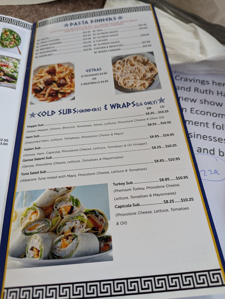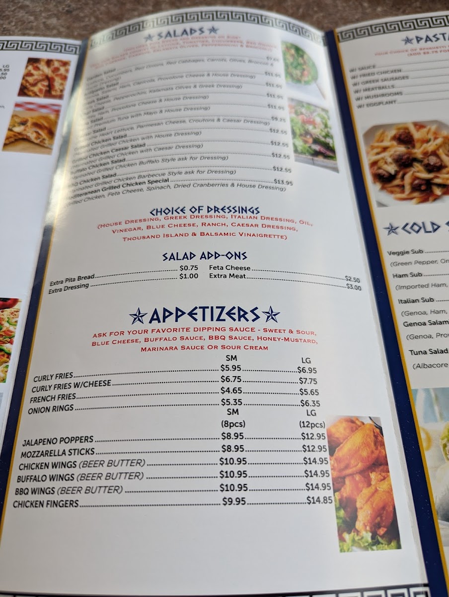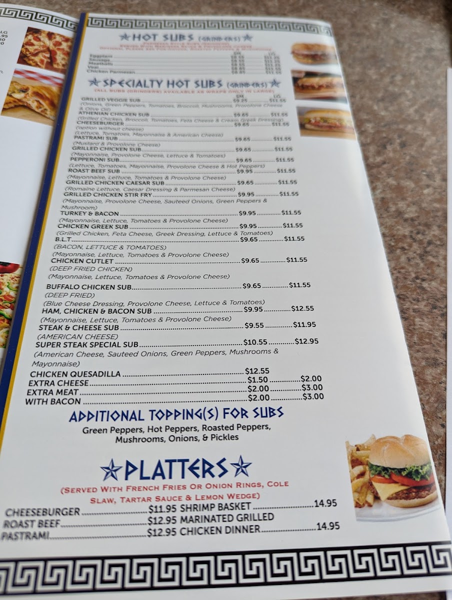 The restaurant also excels in its selection of wraps, including the Athenian Chix Wrap and Buff Chix Wrap, which provide a fresh and savory alternative to traditional sandwiches. For fans of classic Greek cuisine, the Greek Gyro W/Fries and the Grilled Chix Gyro W/Fries offer a satisfying, flavorful experience. If you're in the mood for pasta, the Cheese Ravioli or Manicotti are comforting options, perfect for a cozy meal.